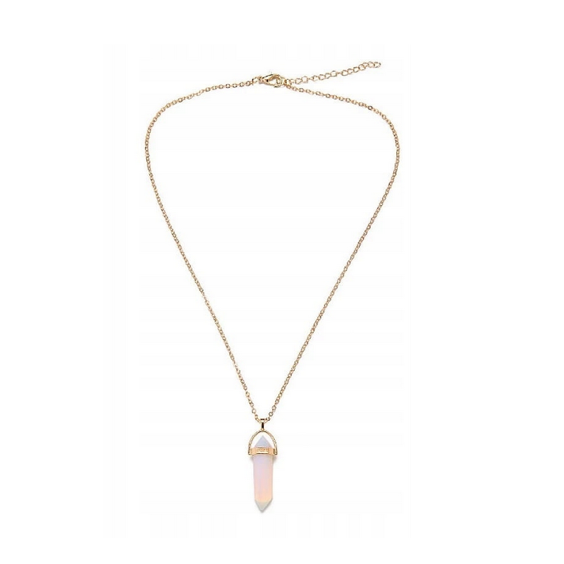 Tento náhrdelník kombinuje jemný dizajn s hlbším významom. Na tenkej zlatej retiazke sa nachádza brúsený prívesok z opalitu – kameňa, ktorý sa vyznačuje opalizujúcim efektom a mení odtiene podľa dopadu svetla od jemne bielych po modrasté či ružové tóny.