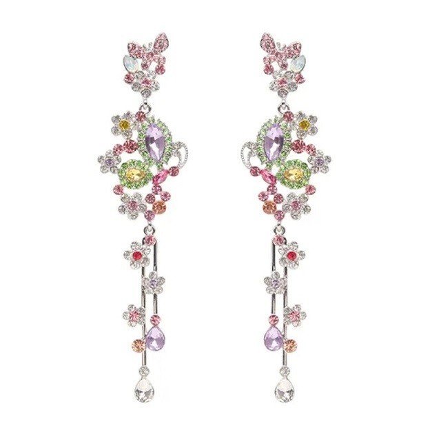 Očarujúce postriebrené náušnice so zirkónmi spájajú jemnú krásu prírody s luxusným dizajnom. Bohato zdobené kvietkami a motýľmi, doplnené farebnými zirkónmi, pôsobia romanticky, žensky a pri pohybe nádherne odrážajú svetlo. Dlhé visacie prevedenie predlžuje líniu krku a dodáva tvári eleganciu. Sú vyrobené z kvalitnej kovovej zliatiny s hypoalergénnou povrchovou úpravou bez obsahu niklu, takže sú vhodné aj pre citlivú pokožku. Trojitá galvanizácia zaručuje, že si náušnice zachovajú svoj žiarivý vzhľad a farby aj pri dlhodobom nosení. Perfektné na večerné podujatia, oslavy, spoločenské akcie alebo ako výnimočný darček.
