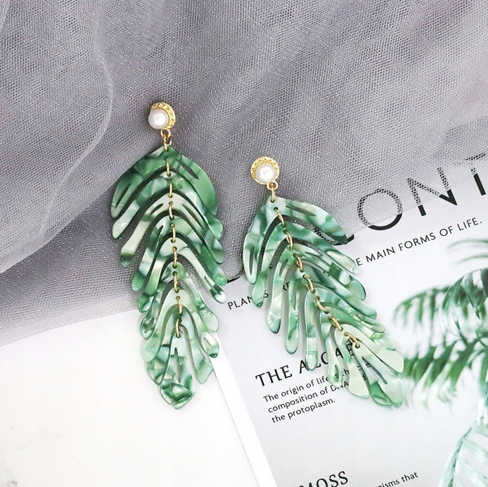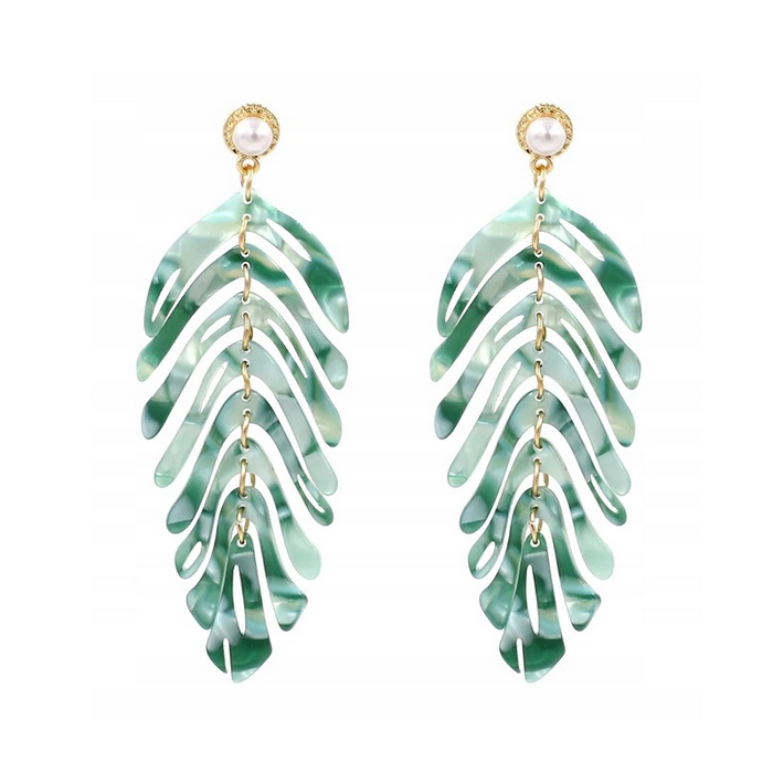 Originálne zelené náušnice s motívom listu Monstery a perlovým detailom pre tropický nádych