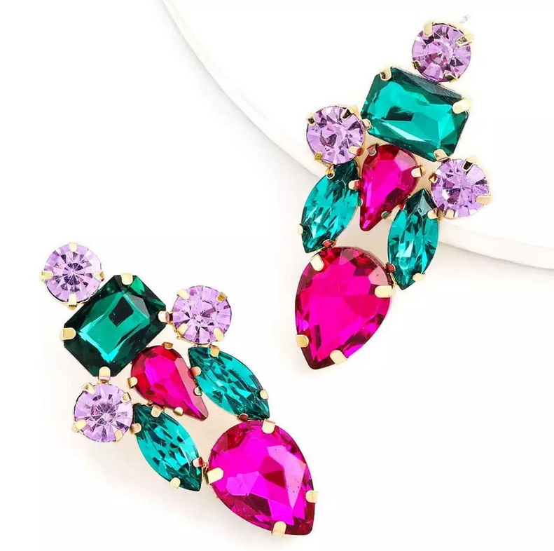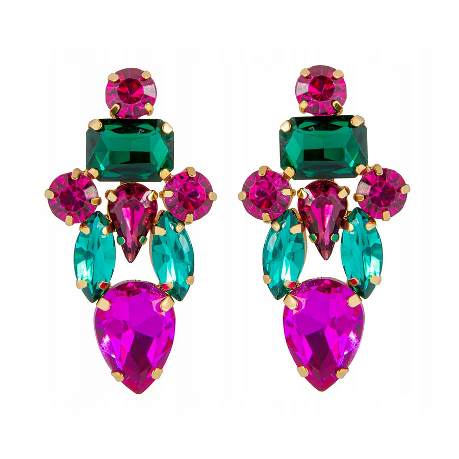 Tieto krištáľové náušnice sú skutočným šperkom, ktorý upúta na prvý pohľad. Farebné zirkóny v kombinácii s výrazným dizajnom vytvárajú luxusný vzhľad vhodný na spoločenské príležitosti aj elegantné outfity.