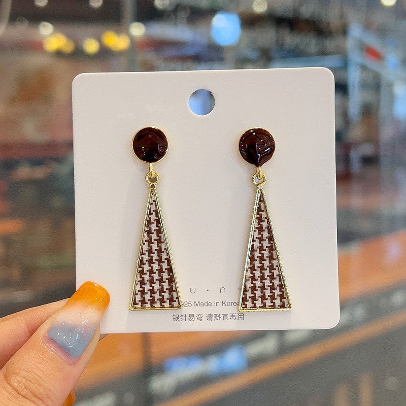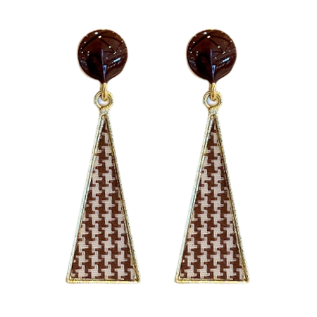 Štýlové visacie náušnice v zlatej farbe s hnedými kameňmi a trojuholníkovým vzorom. Moderný šperk pre odvážne ženy.