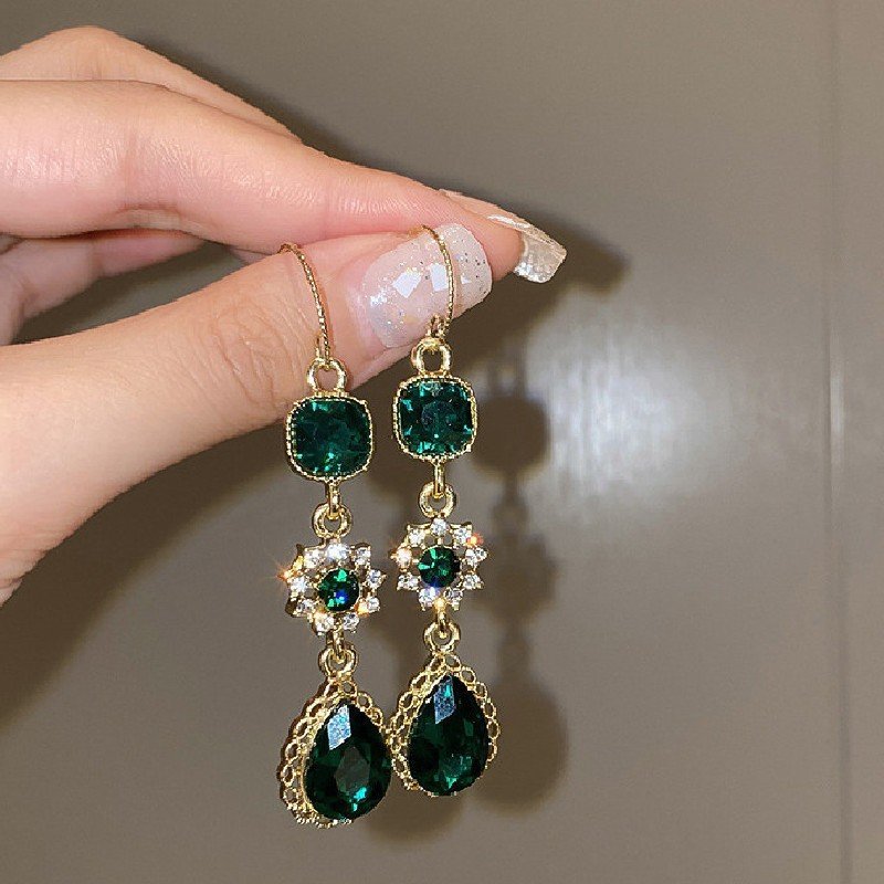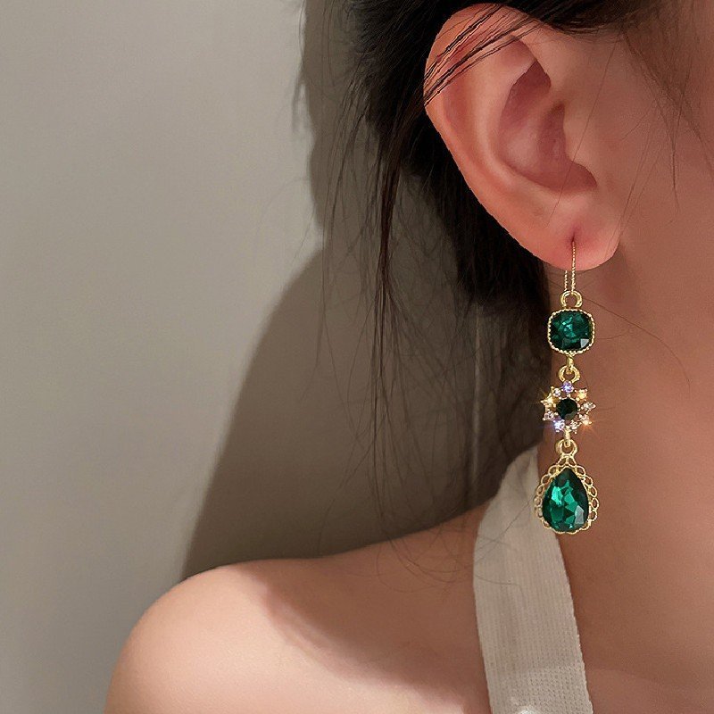 Tieto nádherné náušnice so zelenými zirkónmi spájajú noblesný vzhľad so sofistikovaným dizajnom. Visací štýl s dominantným zeleným kameňom, doplneným menšími trblietavými zirkónmi, dodáva šperku jedinečný pôvab a eleganciu.