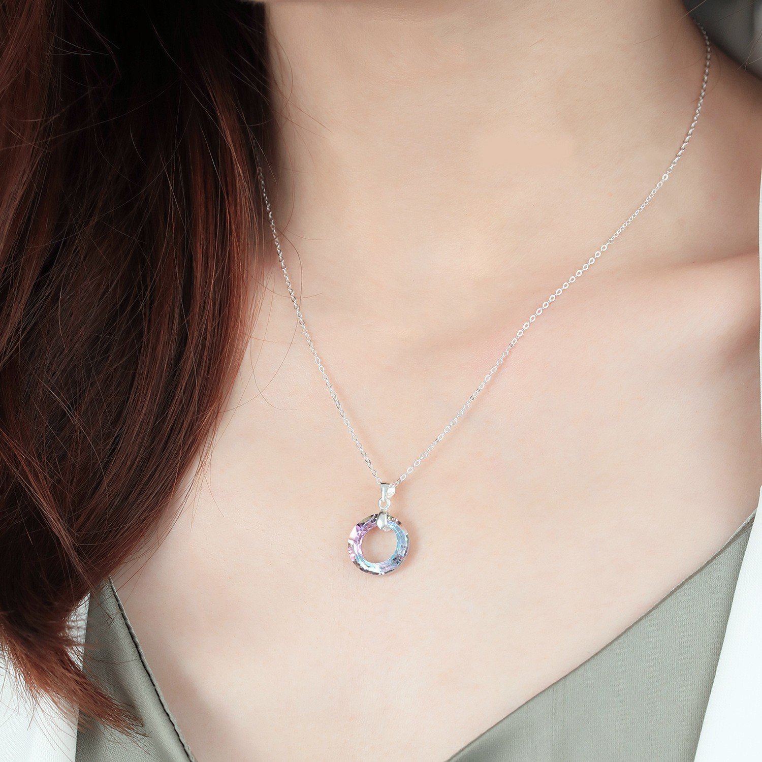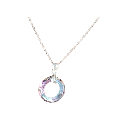 Jemný a elegantný náhrdelník zo striebra rýdzosti 925 s príveskom v tvare fasetovaného kruhu z opalizujúceho krištáľu predstavuje harmonické spojenie minimalizmu a žiarivých farebných odleskov. Kameň sa pri pohybe nádherne trbliece v pastelových tónoch levanduľovej, fialovej a modrej, čím vytvára éterický a ženský efekt. Čistý tvar otvoreného kruhu spolu s lesklou striebornou klemkou zvýrazňujú ľahkosť a nadčasovosť tohto šperku. Motív kruhu symbolizuje rovnováhu, nekonečnosť a vnútorný pokoj, vďaka čomu je náhrdelník dokonalým doplnkom pre moderné, jemné outfity. Elegantný charakter náhrdelníka z neho robí ideálny šperk na každodenné nosenie aj ako darček pre ženu, ktorá miluje minimalizmus a elegantné detaily.