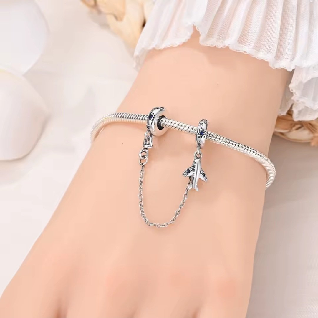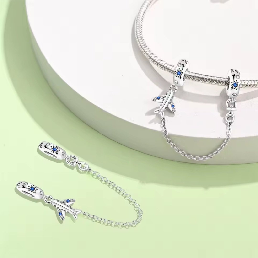 Bezpečnostná reťaz so symbolom lietadla a hviezdičkami je praktický a dekoratívny doplnok k modulárnemu náramku. Vyrobený je zo striebra rýdzosti 925 a skladá sa z dvoch korálikov spojených retiazkou, z ktorých jeden zdobí malé lietadlo s modrými a bielymi kubickými zirkónmi. Ozdobné prvky sú doplnené o motívy hviezd v odtieňoch granátu a modrej, čo dodáva celku ľahkosť a romantický charakter.