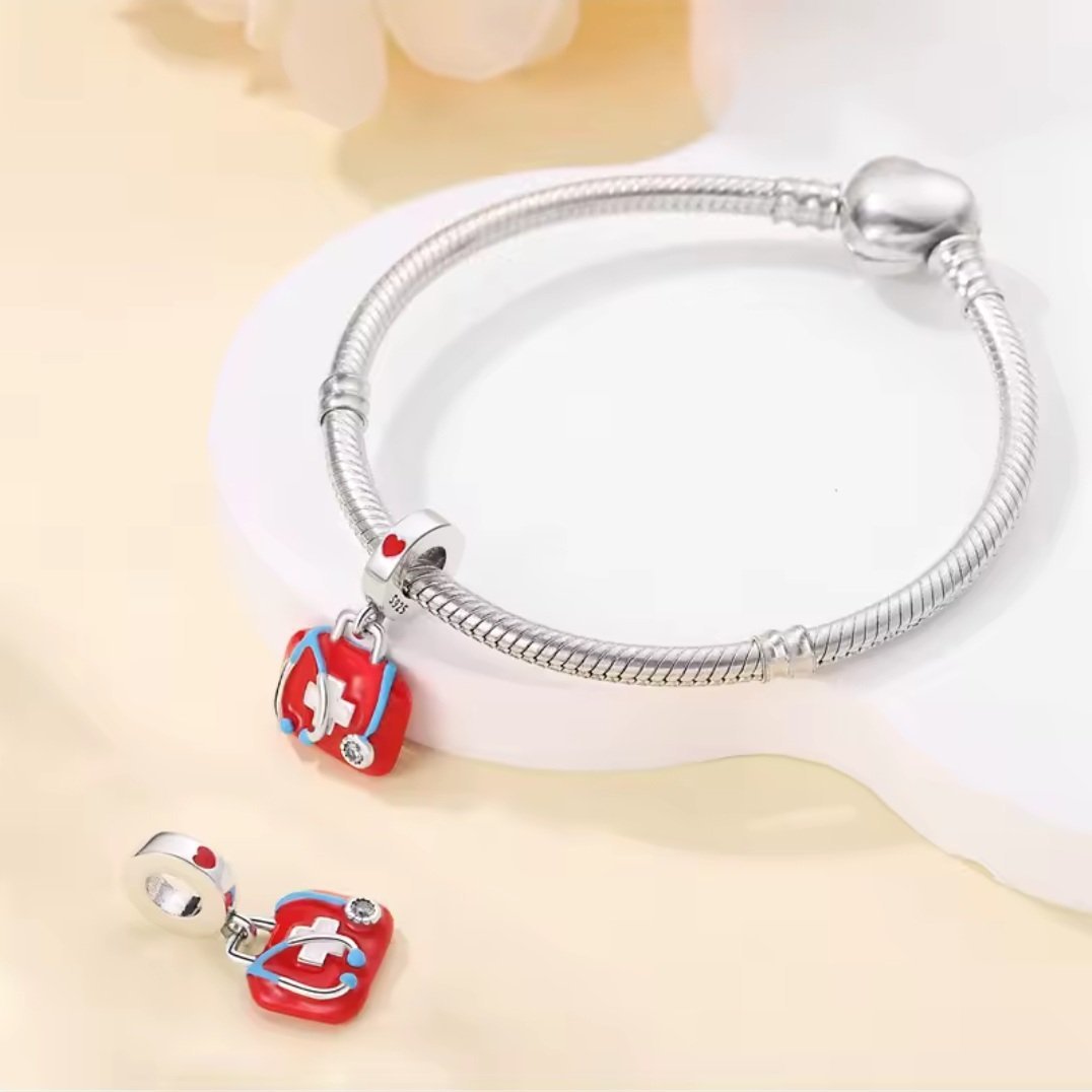 Originálny prívesok značky Eurocharms je vyrobený zo striebra rýdzosti S925 a zaujme kontrastnou kombináciou farieb aj precíznym detailným spracovaním. Lekárska taška v intenzívnej červenej farbe je zdobená bielym krížom a doplnená modrým stetoskopom, ktorý symbolizuje starostlivosť, pomoc a profesionalitu. Vrchnú časť zdobí strieborná rukoväť a červené srdce ako výraz láskavosti a ľudského prístupu v medicíne. Jemný kubický zirkón dodáva prívesku žiarivý detail. Tento tematický prívesok je ideálnym darčekom pre lekárov, zdravotné sestry, záchranárov či študentov medicíny ako symbol ich povolania. Prívesok je určený pre modulárne náramky so štandardným otvorom. Súčasťou balenia je šperková visačka a k dispozícii je aj možnosť darčekového balenia.