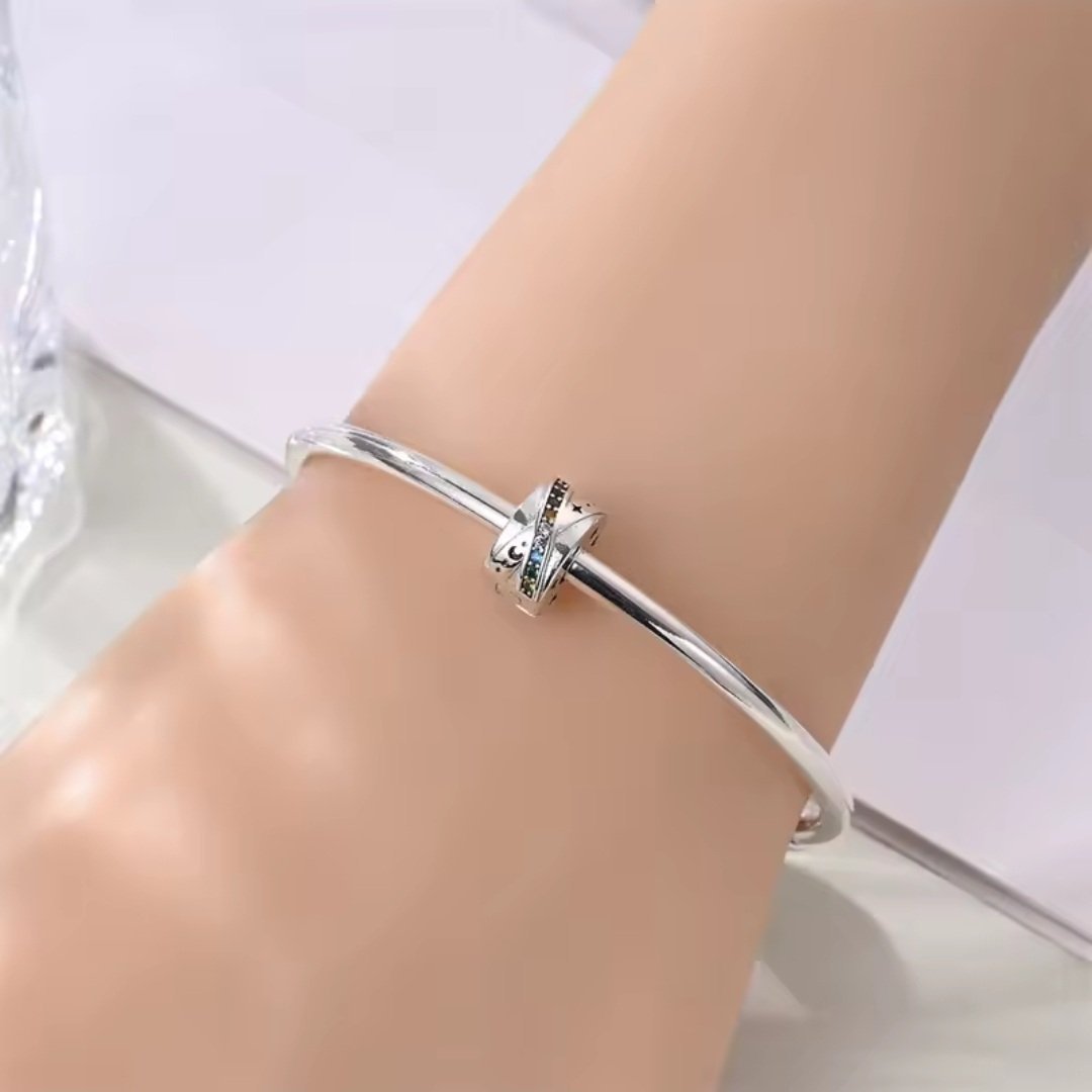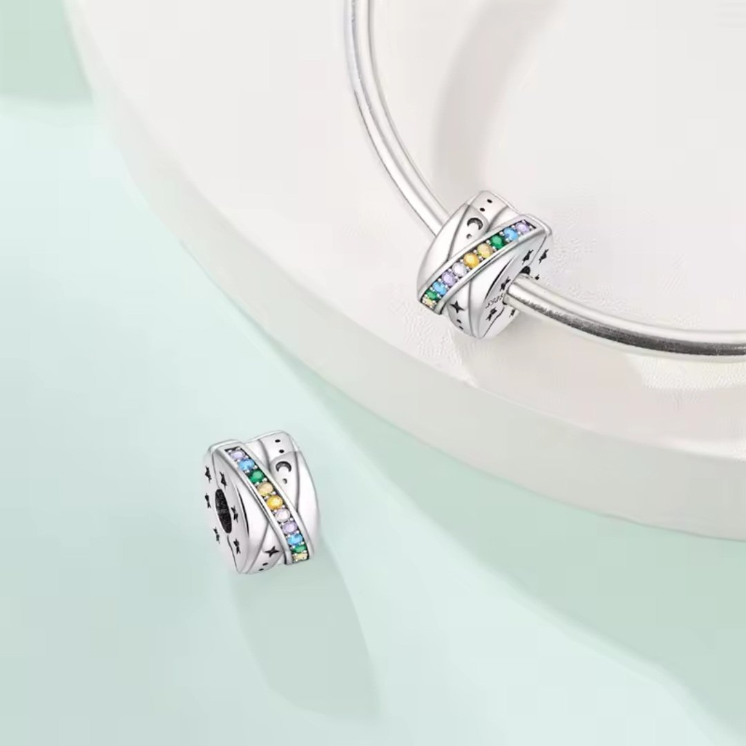 Klipový prívesok je vyrobený zo striebra rýdzosti 925 a zdobený radom žiarivých kubických zirkónov v odtieňoch fialovej, zelenej, modrej, žltej a červenej. Bočné strany sú dekorované gravírovanými hviezdami a mesiačikmi, ktoré dodávajú šperku vesmírny nádych. Povrch s krížovým efektom zvýrazňuje jeho trojrozmerný tvar a dodáva moderný vzhľad. Tento klip slúži ako praktický oddeľovač na modulárnom náramku, ktorý udržiava šperky stabilne na mieste a zároveň pôsobí ako elegantná ozdoba.