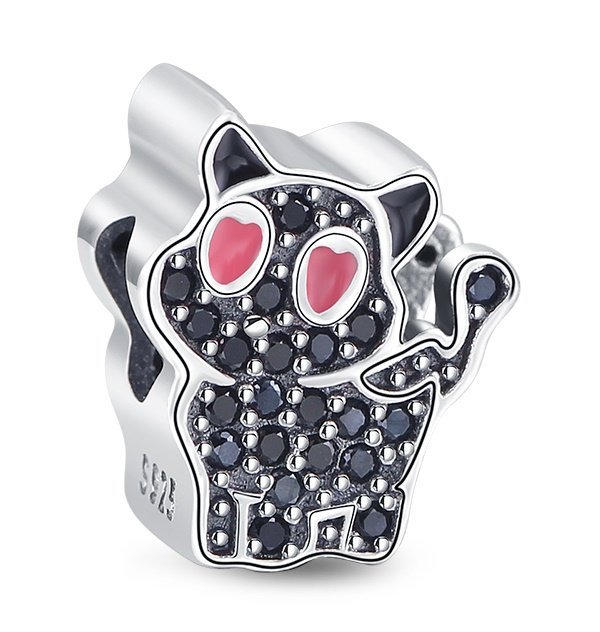 Black Kitten with Hearts kúzlo obsahuje rozkošnú mačku zdobenú tmavými kryštálmi a ružovými očami v tvare srdca. Je vyrobený zo striebra a zaujme kontrastom trblietavých čiernych kameňov a lešteným povrchom. Silueta mačky so zdvihnutou labkou jej dodáva hravý, priateľský charakter. Ružové srdiečka namiesto zreníc zdôrazňujú témy lásky a radosti. Kúzlo symbolizuje pripútanosť, lojalitu a nádych tajomstva. Je to ideálna voľba pre ľudí, ktorí si cenia zvieratá a chcú vyjadriť svoje pocity jedinečným spôsobom.