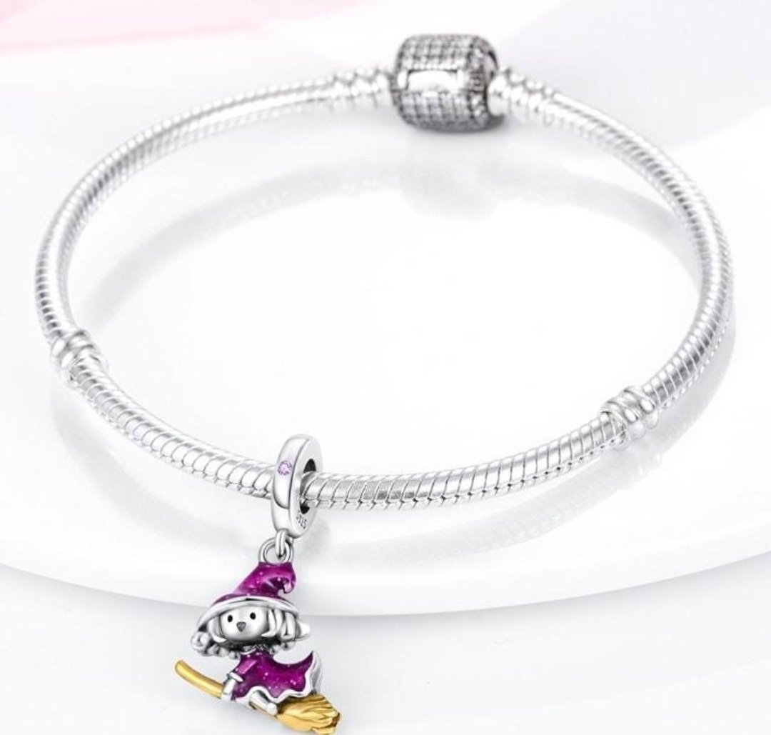 Prívesok Čarodejnica na metle je rozprávkovým doplnkom ku každému modulárnemu náramku. Vyrobený z kvalitného striebra rýdzosti 925, zobrazuje čarodejnicu v šatách a klobúku s fialovým smaltom, ktorý dodáva šperku magický a tajomný vzhľad.