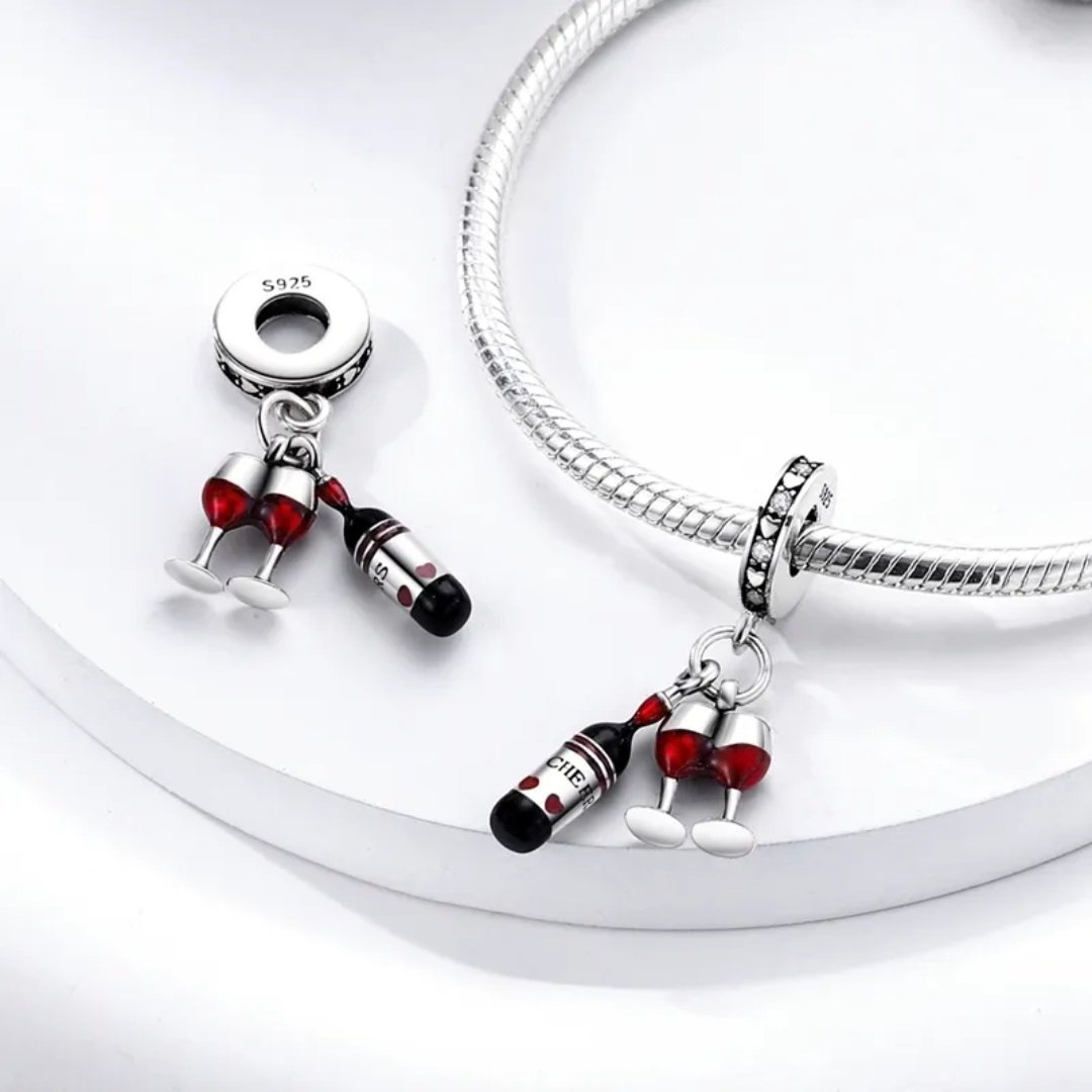Štýlový prívesok zo striebra 925 s fľašou vína a dvoma pohármi – symbol radosti, oslavy a výnimočných chvíľ s blízkymi.