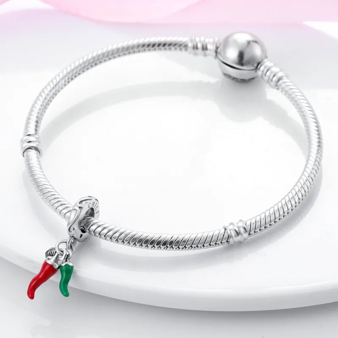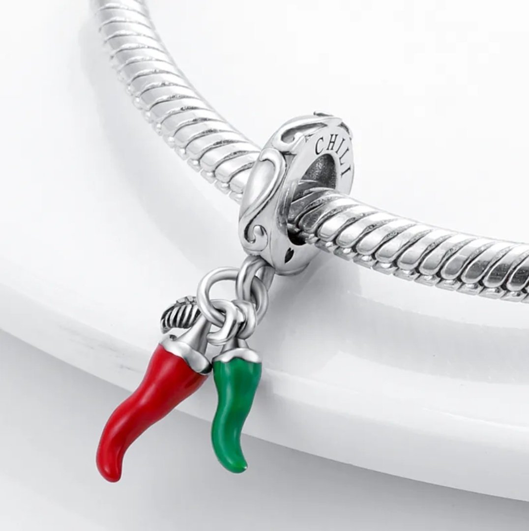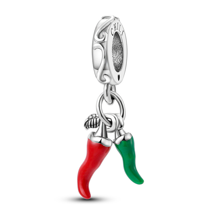 Prívesok Chili papričky je výrazný a originálny doplnok vyrobený z rýdzeho striebra 925, ktorý okamžite zaujme svojím jedinečným dizajnom. Dve farebné papričky – červená a zelená – symbolizujú energiu, vášeň a štipľavý náboj, ktorý dodáva šperku osobitý charakter.