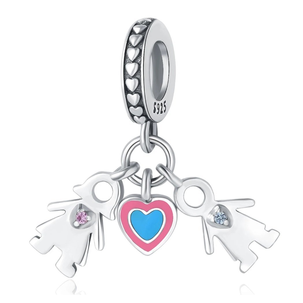 Postavičky detí sú zdobené drobnými kubickými zirkónmi – ružovým pre dievčatko a modrým pre chlapčeka, čo podčiarkuje ich jedinečnosť. Ústredným motívom je srdce so sýtomodrým stredom, lemované ružovým obrysom, ktoré dodáva prívesku teplý, rodinný nádych.