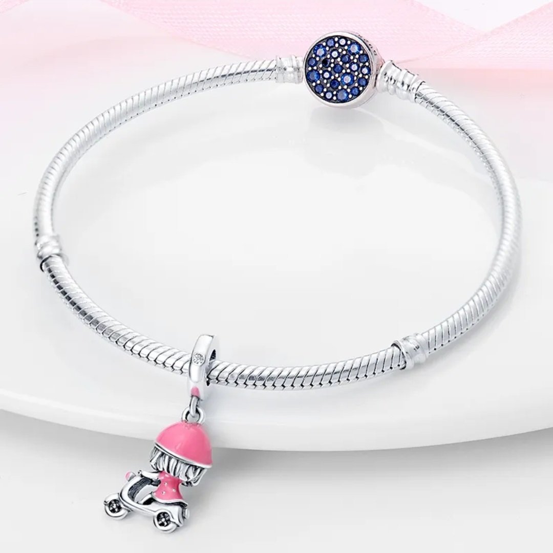 Prívesok Dievča na Skútri je vyrobený zo striebra rýdzosti 925. Tento očarujúci šperk zaujme svojou žiarivou farbou a precíznymi detailmi. Dievčatko v ružovej prilbe a šatách pôsobí hravo a mlado, čím dodáva každému náramku jedinečný nádych radosti a energie. Ideálny doplnok pre milovníkov dobrodružstva, cestovania a tých, ktorí si chcú uchovať spomienky na bezstarostné chvíle. Vďaka kvalitnému spracovaniu je prívesok odolný a zachováva si dlhodobý lesk.
