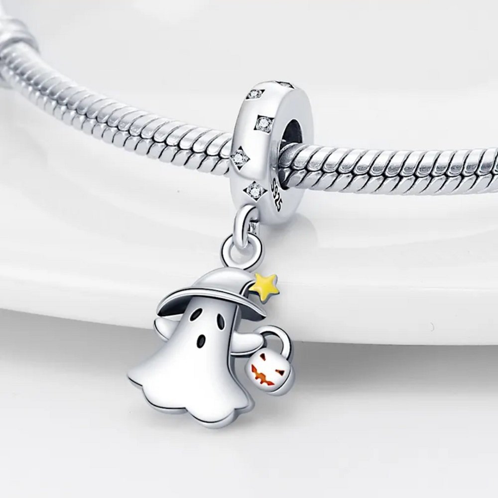Prívesok Duch s tekvicou je hravý a originálny doplnok k modulárnemu náramku, vyrobený z kvalitného striebra rýdzosti 925. Zobrazuje roztomilého ducha oblečeného v bielom plášti so žltou hviezdičkou na klobúku, ktorý v jednej ruke drží vedierko v tvare tekvice s oranžovým úsmevom. Tento detail jasne evokuje tradičného halloweenskeho ducha.