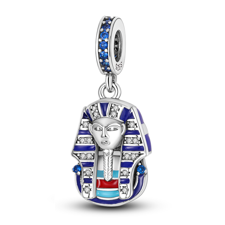 Prívesok Maska faraóna Tutanchamóna z Egypta je jedinečný doplnok inšpirovaný starovekou kultúrou a dedičstvom. Vyrobený zo striebra rýdzosti 925, zobrazuje klasickú podobizeň faraóna s ozdobnou pokrývkou hlavy v odtieňoch granátovej, červenej a modrej. Trblietavé zirkóny a modré kamene po bokoch dodávajú prívesku výrazný a bohatý charakter. Symbolizuje moc, múdrosť a tajomstvo egyptskej civilizácie. Ozdobná obruba s modrými kryštálmi púta pozornosť a dokonale ladí s hlavným motívom.