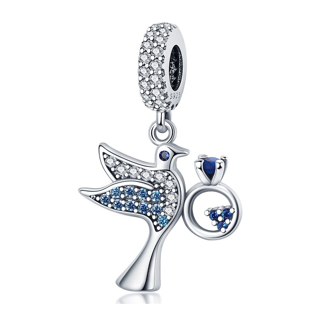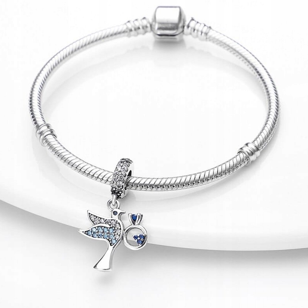Romantický prívesok v tvare vtáčika je vyrobený zo striebra rýdzosti 925 a zdobený modrými a bielymi kubickými zirkónmi, ktoré mu dodávajú jemný lesk a eleganciu. Precízne spracované detaily, ako sú krídla a visiace srdce, podčiarkujú symboliku lásky, slobody a oddanosti.