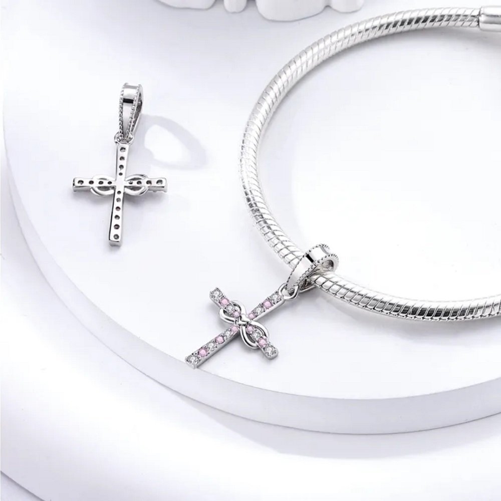 Prívesok je vyrobený zo striebra rýdzosti 925 a predstavuje spojenie elegancie so symbolickým významom. Kríž, jemne doplnený motívom nekonečna, je osadený ružovými a čírymi kubickými zirkónmi, ktoré mu dodávajú výnimočný lesk a noblesu.