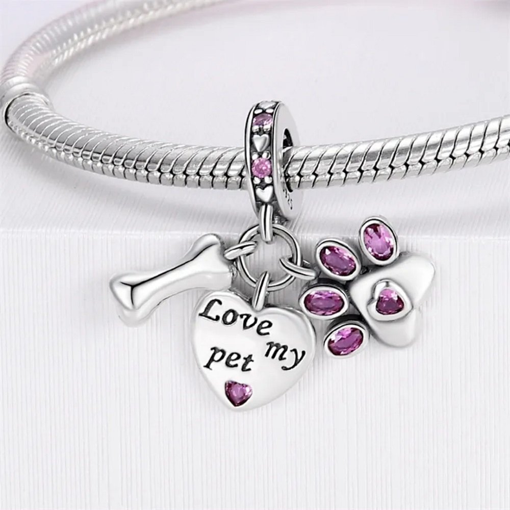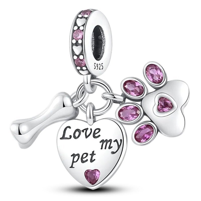 Prívesok Láska ku zvieratku je jedinečným doplnkom každého modulárneho náramku. Vyrobený zo striebra rýdzosti 925 spája odolnosť a eleganciu. Skladá sa z troch prvkov – psia labka zdobená ružovými zirkónmi, srdce s nápisom „Love my pet“ a strieborná kosť. Tento prívesok symbolizuje lásku, vernosť a oddanosť k domácim miláčikom.