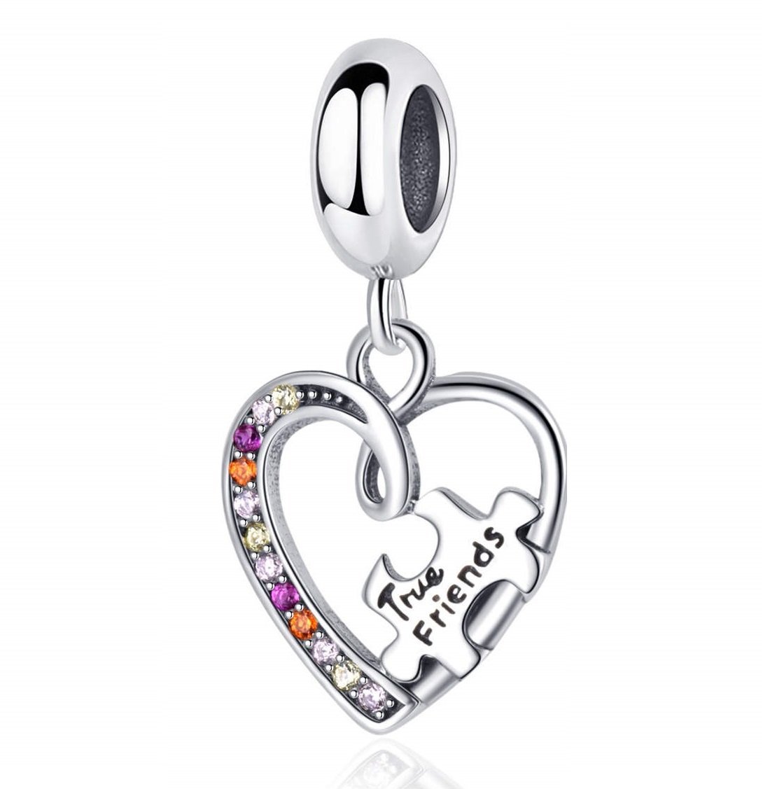 Prívesok True Friendship Heart je vyrobený z kvalitného striebra rýdzosti 925 a predstavuje krásny symbol trvalého priateľstva. Jeho dizajn v tvare srdca s dielikom skladačky a nápisom „True Friends“ vyjadruje nerozdeliteľné puto a hlboké city. Ozdobený farebnými kubickými zirkónmi dodáva jemný lesk a farebný akcent, ktorý oživí každý modulárny náramok.