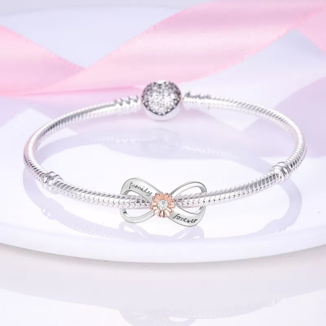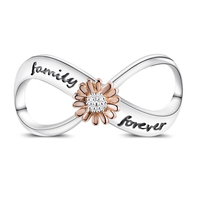 Elegantný prívesok zo striebra 925 so symbolom nekonečna, vyrytými slovami „rodina“ a „navždy“ a dekorom ružovo-zlatej sedmokrásky – symbol lásky a trvalých rodinných pút.