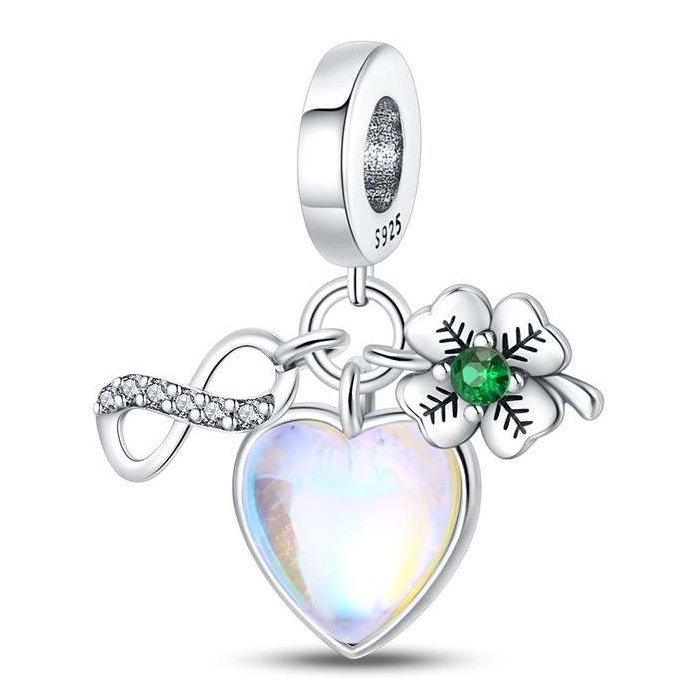 Strieborný prívesok s opálovým srdcom, symbolom nekonečna a štvorlístkom – šperk, ktorý spája lásku, šťastie a eleganciu.