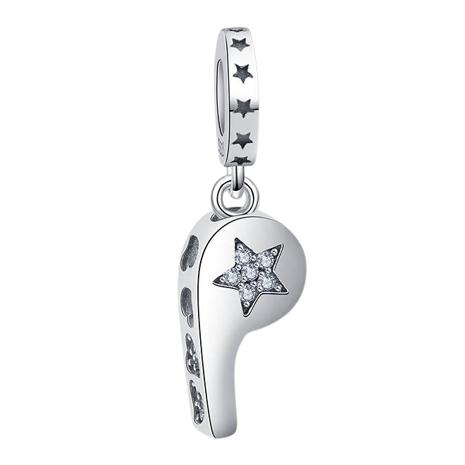 Prívesok Píšťalka s hviezdou a kubickými zirkónmi je jedinečný doplnok pre športovo založené osoby alebo trénerov s vášňou. Vyrobený je zo striebra rýdzosti 925 a zdobený detailom hviezdy osadenej čírymi kubickými zirkónmi, ktoré dodávajú lesk a eleganciu. Obruč je ozdobená výrezmi hviezd, čo prívesku dodáva moderný a dynamický charakter.