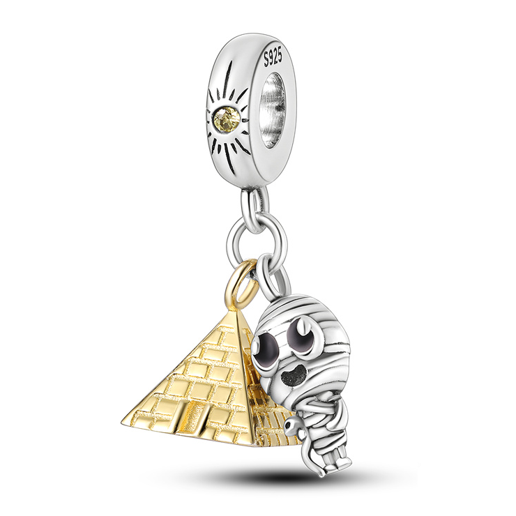 Prívesok Pyramída a Múmia je jedinečný doplnok k modulárnym náramkom, ideálny pre milovníkov histórie a starovekého Egypta. Vyrobený zo striebra rýdzosti 925, vyniká vysokou kvalitou a dlhou trvácnosťou. Charm obsahuje zlatú pyramídu a striebornú múmiu s detailným spracovaním, ktoré mu dodávajú osobitý charakter. Žltý zirkón vsadený do úchytu dodáva prívesku elegantný lesk a noblesu.