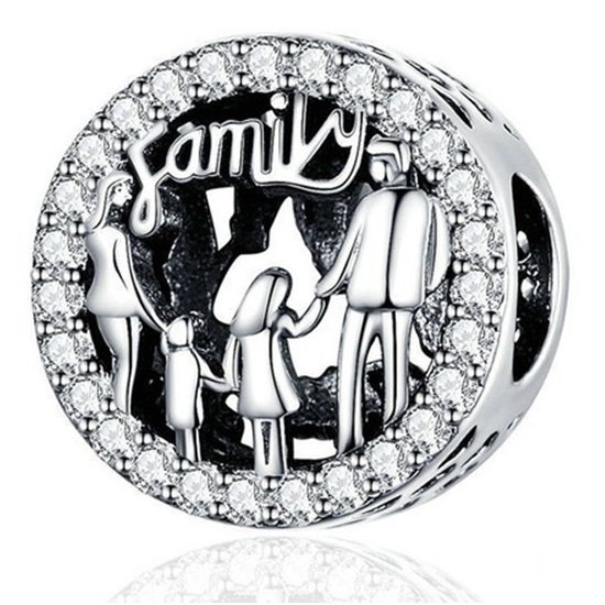 Prívesok Family zobrazuje štvorčlennú rodinu, ktorá sa drží za ruky a je obklopená slovom „family“ a trblietavým kruhom drobných kubických zirkónov. Tento šperk je vyrobený z rýdzeho striebra 925 a symbolizuje spojenie, lásku a blízkosť milovaných.