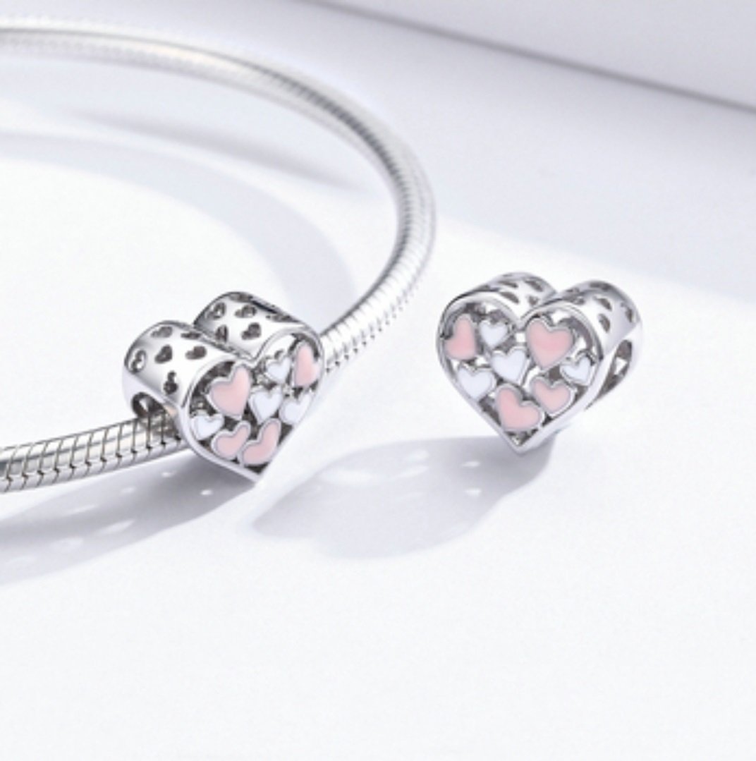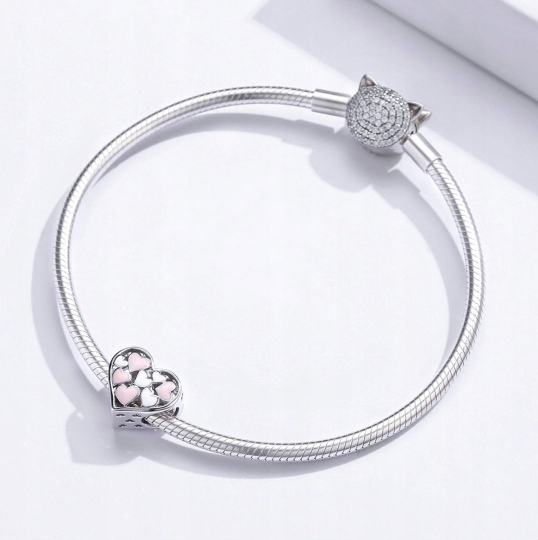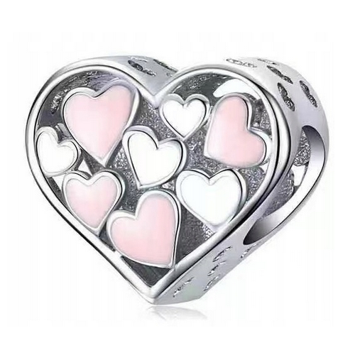 Tento jemný prívesok v tvare veľkého srdca je vyrobený zo striebra rýdzosti 925 a vyplnený drobnejšími srdiečkami v pastelových odtieňoch ružovej a bielej. Smaltovaný povrch dodáva šperku jemný lesk a elegantný charakter, zatiaľ čo prelamovaný dizajn vytvára ľahkosť a zaujímavú hru svetla.