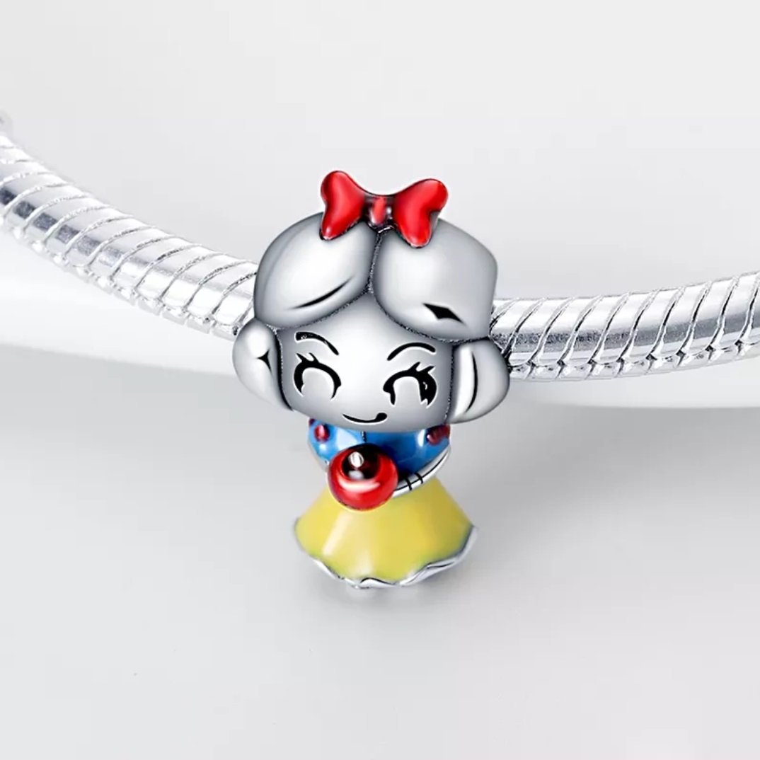 Snehulienka má typické žlté šaty, modrý živôtik a červenú mašľu. V rukách drží červené jablko – symbol známeho príbehu. Tento prívesok je perfektnou voľbou pre každého, kto má rád klasické Disney postavičky a chce pridať do svojej zbierky kúsok plný rozprávkového čara, odvahy a lásky.