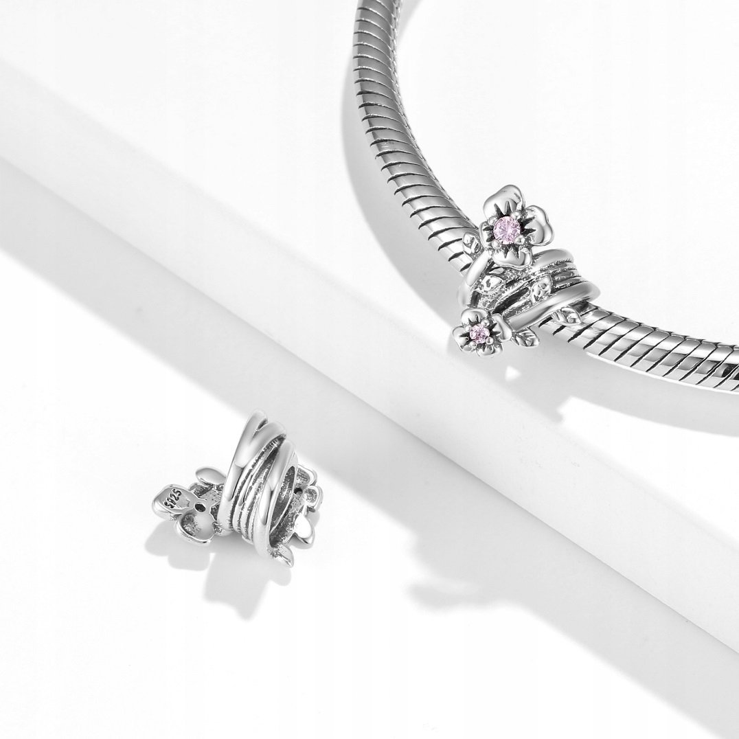 Prívesok je vyrobený zo striebra rýdzosti 925 a zdobený jemnými lístkami a dvoma kvetmi so žiarivými ružovými zirkónmi. Ozdoba v otvorenej kruhovej kompozícii s vetvičkami symbolizuje znovuzrodenie a ženskú energiu. Jemné detaily s trblietavými kameňmi dodávajú šperku eleganciu a ľahkosť. Tento prívesok je ideálny darček pre milovníkov prírody a jemných šperkov so symbolickým významom.