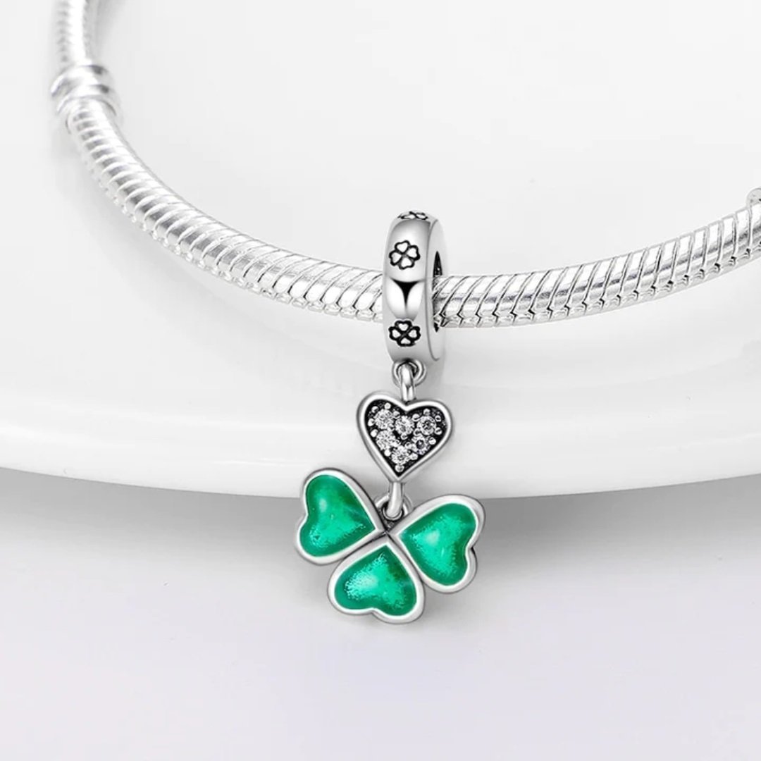 Tento šperk je vyrobený zo striebra rýdzosti 925 a zdobený je žiarivými kubickými zirkónmi v tvare zelenej ďateliny a srdca.
